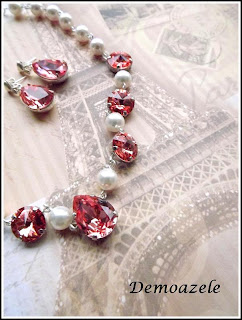 Pentru a da o nota de eleganta colierul este pus in evidenta cu ajutorul unui cristal lacrima Swarovski nuanta Rose Peach si perle Swarovski. Perlele si cristalele se imbina perfect, oferind oricarei dintre voi acel aer misterios al feminitatii.